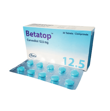 Betatop 12.5 contains Carvedilol, a non-selective beta-blocker with additional alpha-blocking properties. It is used to treat several cardiovascular conditions, including hypertension (high blood pressure), heart failure, and angina. Carvedilol works by relaxing blood vessels, slowing heart rate, and reducing the workload on the heart, thereby improving heart function and lowering blood pressure.