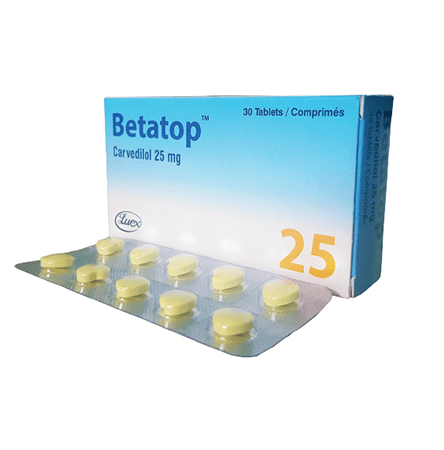 Betatop 25 contains Carvedilol, a non-selective beta-blocker with additional alpha-blocking properties. It is used to treat several cardiovascular conditions, including hypertension (high blood pressure), heart failure, and angina. Carvedilol works by relaxing blood vessels, slowing heart rate, and reducing the workload on the heart, thereby improving heart function and lowering blood pressure.