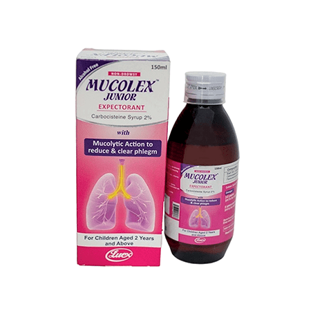 Mucolex Junior Expectorant, is specially formulated for children to manage productive cough and respiratory conditions characterized by excessive mucus production. Its active ingredient, Carbocisteine, is a mucolytic agent that helps thin and loosen mucus, making it easier for children to clear their airways and breathe comfortably.